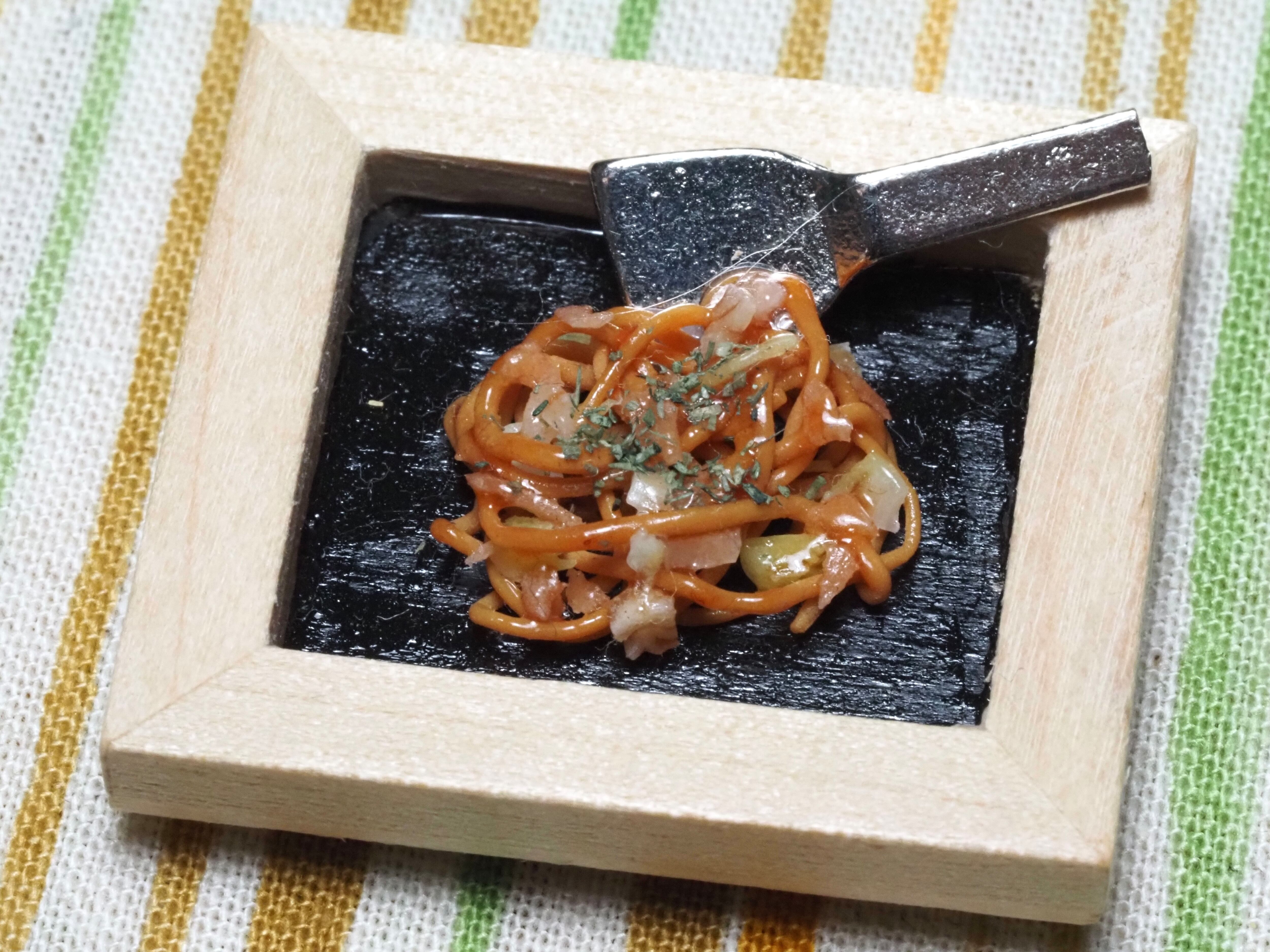 額縁シリーズで、額縁の内側を鉄板に見立ててソース焼きそばを作りました。コテを使ってジュージューさせています(o^^o)